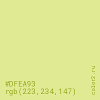 Цвет #DFEA93 в цветовой модели RGB обозначается тремя октетами (223, 234, 147) в десятичном формате и #DFEA93 в шестнадцатиричном (hex) формате, которые являются интенсивностью красного 223 (hex DF), интенсивность зелёного 234 (hex EA) и интенсивность синего 147 (hex 93).