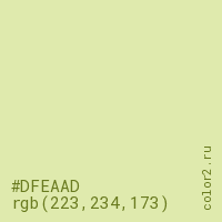 Цвет #DFEAAD в цветовой модели RGB обозначается тремя октетами (223, 234, 173) в десятичном формате и #DFEAAD в шестнадцатиричном (hex) формате, которые являются интенсивностью красного 223 (hex DF), интенсивность зелёного 234 (hex EA) и интенсивность синего 173 (hex AD).