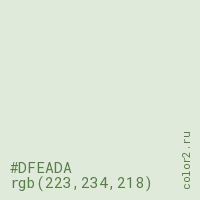 Цвет #DFEADA в цветовой модели RGB обозначается тремя октетами (223, 234, 218) в десятичном формате и #DFEADA в шестнадцатиричном (hex) формате, которые являются интенсивностью красного 223 (hex DF), интенсивность зелёного 234 (hex EA) и интенсивность синего 218 (hex DA).
