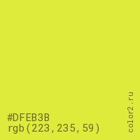 Цвет #DFEB3B в цветовой модели RGB обозначается тремя октетами (223, 235, 59) в десятичном формате и #DFEB3B в шестнадцатиричном (hex) формате, которые являются интенсивностью красного 223 (hex DF), интенсивность зелёного 235 (hex EB) и интенсивность синего 59 (hex 3B).