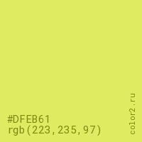 Цвет #DFEB61 в цветовой модели RGB обозначается тремя октетами (223, 235, 97) в десятичном формате и #DFEB61 в шестнадцатиричном (hex) формате, которые являются интенсивностью красного 223 (hex DF), интенсивность зелёного 235 (hex EB) и интенсивность синего 97 (hex 61).