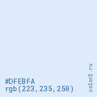 Цвет #DFEBFA в цветовой модели RGB обозначается тремя октетами (223, 235, 250) в десятичном формате и #DFEBFA в шестнадцатиричном (hex) формате, которые являются интенсивностью красного 223 (hex DF), интенсивность зелёного 235 (hex EB) и интенсивность синего 250 (hex FA).