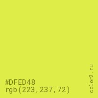 Цвет #DFED48 в цветовой модели RGB обозначается тремя октетами (223, 237, 72) в десятичном формате и #DFED48 в шестнадцатиричном (hex) формате, которые являются интенсивностью красного 223 (hex DF), интенсивность зелёного 237 (hex ED) и интенсивность синего 72 (hex 48).