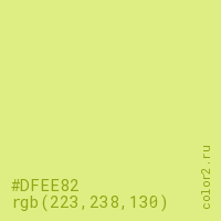 Цвет #DFEE82 в цветовой модели RGB обозначается тремя октетами (223, 238, 130) в десятичном формате и #DFEE82 в шестнадцатиричном (hex) формате, которые являются интенсивностью красного 223 (hex DF), интенсивность зелёного 238 (hex EE) и интенсивность синего 130 (hex 82).