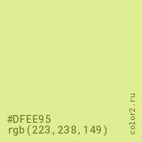 Цвет #DFEE95 в цветовой модели RGB обозначается тремя октетами (223, 238, 149) в десятичном формате и #DFEE95 в шестнадцатиричном (hex) формате, которые являются интенсивностью красного 223 (hex DF), интенсивность зелёного 238 (hex EE) и интенсивность синего 149 (hex 95).