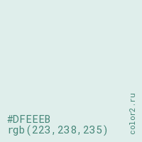 Цвет #DFEEEB в цветовой модели RGB обозначается тремя октетами (223, 238, 235) в десятичном формате и #DFEEEB в шестнадцатиричном (hex) формате, которые являются интенсивностью красного 223 (hex DF), интенсивность зелёного 238 (hex EE) и интенсивность синего 235 (hex EB).