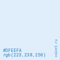 Цвет #DFEEFA в цветовой модели RGB обозначается тремя октетами (223, 238, 250) в десятичном формате и #DFEEFA в шестнадцатиричном (hex) формате, которые являются интенсивностью красного 223 (hex DF), интенсивность зелёного 238 (hex EE) и интенсивность синего 250 (hex FA).