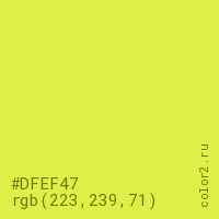 Цвет #DFEF47 в цветовой модели RGB обозначается тремя октетами (223, 239, 71) в десятичном формате и #DFEF47 в шестнадцатиричном (hex) формате, которые являются интенсивностью красного 223 (hex DF), интенсивность зелёного 239 (hex EF) и интенсивность синего 71 (hex 47).