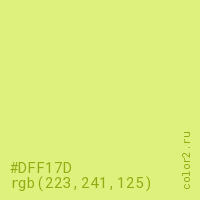 Цвет #DFF17D в цветовой модели RGB обозначается тремя октетами (223, 241, 125) в десятичном формате и #DFF17D в шестнадцатиричном (hex) формате, которые являются интенсивностью красного 223 (hex DF), интенсивность зелёного 241 (hex F1) и интенсивность синего 125 (hex 7D).