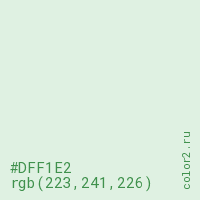 Цвет #DFF1E2 в цветовой модели RGB обозначается тремя октетами (223, 241, 226) в десятичном формате и #DFF1E2 в шестнадцатиричном (hex) формате, которые являются интенсивностью красного 223 (hex DF), интенсивность зелёного 241 (hex F1) и интенсивность синего 226 (hex E2).