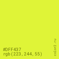 Цвет #DFF437 в цветовой модели RGB обозначается тремя октетами (223, 244, 55) в десятичном формате и #DFF437 в шестнадцатиричном (hex) формате, которые являются интенсивностью красного 223 (hex DF), интенсивность зелёного 244 (hex F4) и интенсивность синего 55 (hex 37).