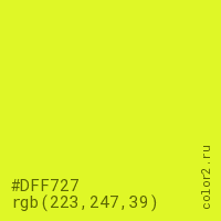 Цвет #DFF727 в цветовой модели RGB обозначается тремя октетами (223, 247, 39) в десятичном формате и #DFF727 в шестнадцатиричном (hex) формате, которые являются интенсивностью красного 223 (hex DF), интенсивность зелёного 247 (hex F7) и интенсивность синего 39 (hex 27).