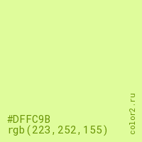 Цвет #DFFC9B в цветовой модели RGB обозначается тремя октетами (223, 252, 155) в десятичном формате и #DFFC9B в шестнадцатиричном (hex) формате, которые являются интенсивностью красного 223 (hex DF), интенсивность зелёного 252 (hex FC) и интенсивность синего 155 (hex 9B).