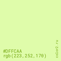 Цвет #DFFCAA в цветовой модели RGB обозначается тремя октетами (223, 252, 170) в десятичном формате и #DFFCAA в шестнадцатиричном (hex) формате, которые являются интенсивностью красного 223 (hex DF), интенсивность зелёного 252 (hex FC) и интенсивность синего 170 (hex AA).
