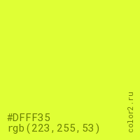 Цвет #DFFF35 в цветовой модели RGB обозначается тремя октетами (223, 255, 53) в десятичном формате и #DFFF35 в шестнадцатиричном (hex) формате, которые являются интенсивностью красного 223 (hex DF), интенсивность зелёного 255 (hex FF) и интенсивность синего 53 (hex 35).