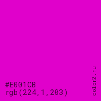 Цвет #E001CB в цветовой модели RGB обозначается тремя октетами (224, 1, 203) в десятичном формате и #E001CB в шестнадцатиричном (hex) формате, которые являются интенсивностью красного 224 (hex E0), интенсивность зелёного 1 (hex 01) и интенсивность синего 203 (hex CB).