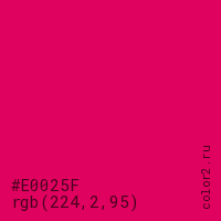 Цвет #E0025F в цветовой модели RGB обозначается тремя октетами (224, 2, 95) в десятичном формате и #E0025F в шестнадцатиричном (hex) формате, которые являются интенсивностью красного 224 (hex E0), интенсивность зелёного 2 (hex 02) и интенсивность синего 95 (hex 5F).