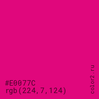 Цвет #E0077C в цветовой модели RGB обозначается тремя октетами (224, 7, 124) в десятичном формате и #E0077C в шестнадцатиричном (hex) формате, которые являются интенсивностью красного 224 (hex E0), интенсивность зелёного 7 (hex 07) и интенсивность синего 124 (hex 7C).