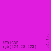 Цвет #E01CDF в цветовой модели RGB обозначается тремя октетами (224, 28, 223) в десятичном формате и #E01CDF в шестнадцатиричном (hex) формате, которые являются интенсивностью красного 224 (hex E0), интенсивность зелёного 28 (hex 1C) и интенсивность синего 223 (hex DF).