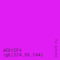 Цвет #E01EF4 в цветовой модели RGB обозначается тремя октетами (224, 30, 244) в десятичном формате и #E01EF4 в шестнадцатиричном (hex) формате, которые являются интенсивностью красного 224 (hex E0), интенсивность зелёного 30 (hex 1E) и интенсивность синего 244 (hex F4).