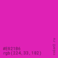Цвет #E021B6 в цветовой модели RGB обозначается тремя октетами (224, 33, 182) в десятичном формате и #E021B6 в шестнадцатиричном (hex) формате, которые являются интенсивностью красного 224 (hex E0), интенсивность зелёного 33 (hex 21) и интенсивность синего 182 (hex B6).