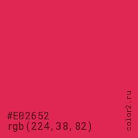 Цвет #E02652 в цветовой модели RGB обозначается тремя октетами (224, 38, 82) в десятичном формате и #E02652 в шестнадцатиричном (hex) формате, которые являются интенсивностью красного 224 (hex E0), интенсивность зелёного 38 (hex 26) и интенсивность синего 82 (hex 52).