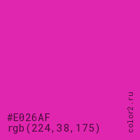 Цвет #E026AF в цветовой модели RGB обозначается тремя октетами (224, 38, 175) в десятичном формате и #E026AF в шестнадцатиричном (hex) формате, которые являются интенсивностью красного 224 (hex E0), интенсивность зелёного 38 (hex 26) и интенсивность синего 175 (hex AF).