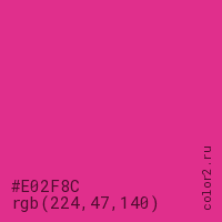Цвет #E02F8C в цветовой модели RGB обозначается тремя октетами (224, 47, 140) в десятичном формате и #E02F8C в шестнадцатиричном (hex) формате, которые являются интенсивностью красного 224 (hex E0), интенсивность зелёного 47 (hex 2F) и интенсивность синего 140 (hex 8C).