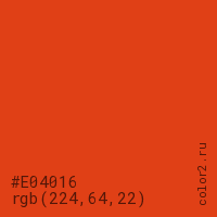 Цвет #E04016 в цветовой модели RGB обозначается тремя октетами (224, 64, 22) в десятичном формате и #E04016 в шестнадцатиричном (hex) формате, которые являются интенсивностью красного 224 (hex E0), интенсивность зелёного 64 (hex 40) и интенсивность синего 22 (hex 16).