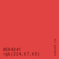 Цвет #E04341 в цветовой модели RGB обозначается тремя октетами (224, 67, 65) в десятичном формате и #E04341 в шестнадцатиричном (hex) формате, которые являются интенсивностью красного 224 (hex E0), интенсивность зелёного 67 (hex 43) и интенсивность синего 65 (hex 41).