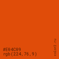 Цвет #E04C09 в цветовой модели RGB обозначается тремя октетами (224, 76, 9) в десятичном формате и #E04C09 в шестнадцатиричном (hex) формате, которые являются интенсивностью красного 224 (hex E0), интенсивность зелёного 76 (hex 4C) и интенсивность синего 9 (hex 09).