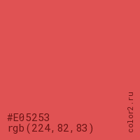 Цвет #E05253 в цветовой модели RGB обозначается тремя октетами (224, 82, 83) в десятичном формате и #E05253 в шестнадцатиричном (hex) формате, которые являются интенсивностью красного 224 (hex E0), интенсивность зелёного 82 (hex 52) и интенсивность синего 83 (hex 53).