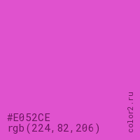 Цвет #E052CE в цветовой модели RGB обозначается тремя октетами (224, 82, 206) в десятичном формате и #E052CE в шестнадцатиричном (hex) формате, которые являются интенсивностью красного 224 (hex E0), интенсивность зелёного 82 (hex 52) и интенсивность синего 206 (hex CE).