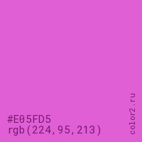 Цвет #E05FD5 в цветовой модели RGB обозначается тремя октетами (224, 95, 213) в десятичном формате и #E05FD5 в шестнадцатиричном (hex) формате, которые являются интенсивностью красного 224 (hex E0), интенсивность зелёного 95 (hex 5F) и интенсивность синего 213 (hex D5).