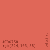 Цвет #E06758 в цветовой модели RGB обозначается тремя октетами (224, 103, 88) в десятичном формате и #E06758 в шестнадцатиричном (hex) формате, которые являются интенсивностью красного 224 (hex E0), интенсивность зелёного 103 (hex 67) и интенсивность синего 88 (hex 58).