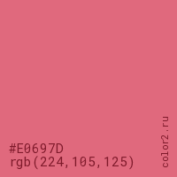 Цвет #E0697D в цветовой модели RGB обозначается тремя октетами (224, 105, 125) в десятичном формате и #E0697D в шестнадцатиричном (hex) формате, которые являются интенсивностью красного 224 (hex E0), интенсивность зелёного 105 (hex 69) и интенсивность синего 125 (hex 7D).