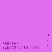 Цвет #E06EEE в цветовой модели RGB обозначается тремя октетами (224, 110, 238) в десятичном формате и #E06EEE в шестнадцатиричном (hex) формате, которые являются интенсивностью красного 224 (hex E0), интенсивность зелёного 110 (hex 6E) и интенсивность синего 238 (hex EE).