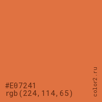 Цвет #E07241 в цветовой модели RGB обозначается тремя октетами (224, 114, 65) в десятичном формате и #E07241 в шестнадцатиричном (hex) формате, которые являются интенсивностью красного 224 (hex E0), интенсивность зелёного 114 (hex 72) и интенсивность синего 65 (hex 41).