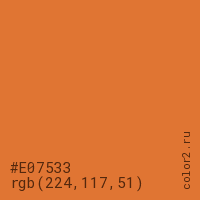 Цвет #E07533 в цветовой модели RGB обозначается тремя октетами (224, 117, 51) в десятичном формате и #E07533 в шестнадцатиричном (hex) формате, которые являются интенсивностью красного 224 (hex E0), интенсивность зелёного 117 (hex 75) и интенсивность синего 51 (hex 33).