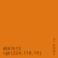 Цвет #E07613 в цветовой модели RGB обозначается тремя октетами (224, 118, 19) в десятичном формате и #E07613 в шестнадцатиричном (hex) формате, которые являются интенсивностью красного 224 (hex E0), интенсивность зелёного 118 (hex 76) и интенсивность синего 19 (hex 13).