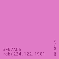 Цвет #E07AC6 в цветовой модели RGB обозначается тремя октетами (224, 122, 198) в десятичном формате и #E07AC6 в шестнадцатиричном (hex) формате, которые являются интенсивностью красного 224 (hex E0), интенсивность зелёного 122 (hex 7A) и интенсивность синего 198 (hex C6).