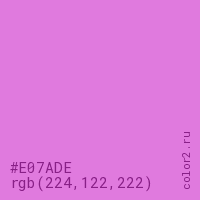 Цвет #E07ADE в цветовой модели RGB обозначается тремя октетами (224, 122, 222) в десятичном формате и #E07ADE в шестнадцатиричном (hex) формате, которые являются интенсивностью красного 224 (hex E0), интенсивность зелёного 122 (hex 7A) и интенсивность синего 222 (hex DE).
