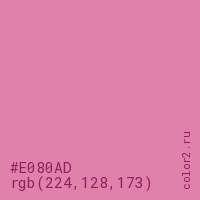 Цвет #E080AD в цветовой модели RGB обозначается тремя октетами (224, 128, 173) в десятичном формате и #E080AD в шестнадцатиричном (hex) формате, которые являются интенсивностью красного 224 (hex E0), интенсивность зелёного 128 (hex 80) и интенсивность синего 173 (hex AD).