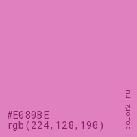Цвет #E080BE в цветовой модели RGB обозначается тремя октетами (224, 128, 190) в десятичном формате и #E080BE в шестнадцатиричном (hex) формате, которые являются интенсивностью красного 224 (hex E0), интенсивность зелёного 128 (hex 80) и интенсивность синего 190 (hex BE).