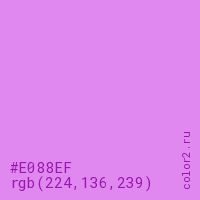 Цвет #E088EF в цветовой модели RGB обозначается тремя октетами (224, 136, 239) в десятичном формате и #E088EF в шестнадцатиричном (hex) формате, которые являются интенсивностью красного 224 (hex E0), интенсивность зелёного 136 (hex 88) и интенсивность синего 239 (hex EF).