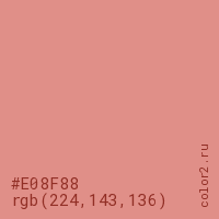 Цвет #E08F88 в цветовой модели RGB обозначается тремя октетами (224, 143, 136) в десятичном формате и #E08F88 в шестнадцатиричном (hex) формате, которые являются интенсивностью красного 224 (hex E0), интенсивность зелёного 143 (hex 8F) и интенсивность синего 136 (hex 88).