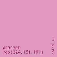 Цвет #E097BF в цветовой модели RGB обозначается тремя октетами (224, 151, 191) в десятичном формате и #E097BF в шестнадцатиричном (hex) формате, которые являются интенсивностью красного 224 (hex E0), интенсивность зелёного 151 (hex 97) и интенсивность синего 191 (hex BF).