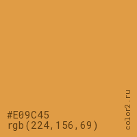 Цвет #E09C45 в цветовой модели RGB обозначается тремя октетами (224, 156, 69) в десятичном формате и #E09C45 в шестнадцатиричном (hex) формате, которые являются интенсивностью красного 224 (hex E0), интенсивность зелёного 156 (hex 9C) и интенсивность синего 69 (hex 45).