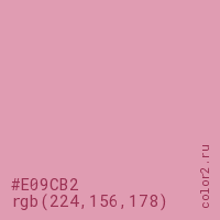 Цвет #E09CB2 в цветовой модели RGB обозначается тремя октетами (224, 156, 178) в десятичном формате и #E09CB2 в шестнадцатиричном (hex) формате, которые являются интенсивностью красного 224 (hex E0), интенсивность зелёного 156 (hex 9C) и интенсивность синего 178 (hex B2).