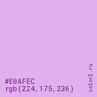 Цвет #E0AFEC в цветовой модели RGB обозначается тремя октетами (224, 175, 236) в десятичном формате и #E0AFEC в шестнадцатиричном (hex) формате, которые являются интенсивностью красного 224 (hex E0), интенсивность зелёного 175 (hex AF) и интенсивность синего 236 (hex EC).